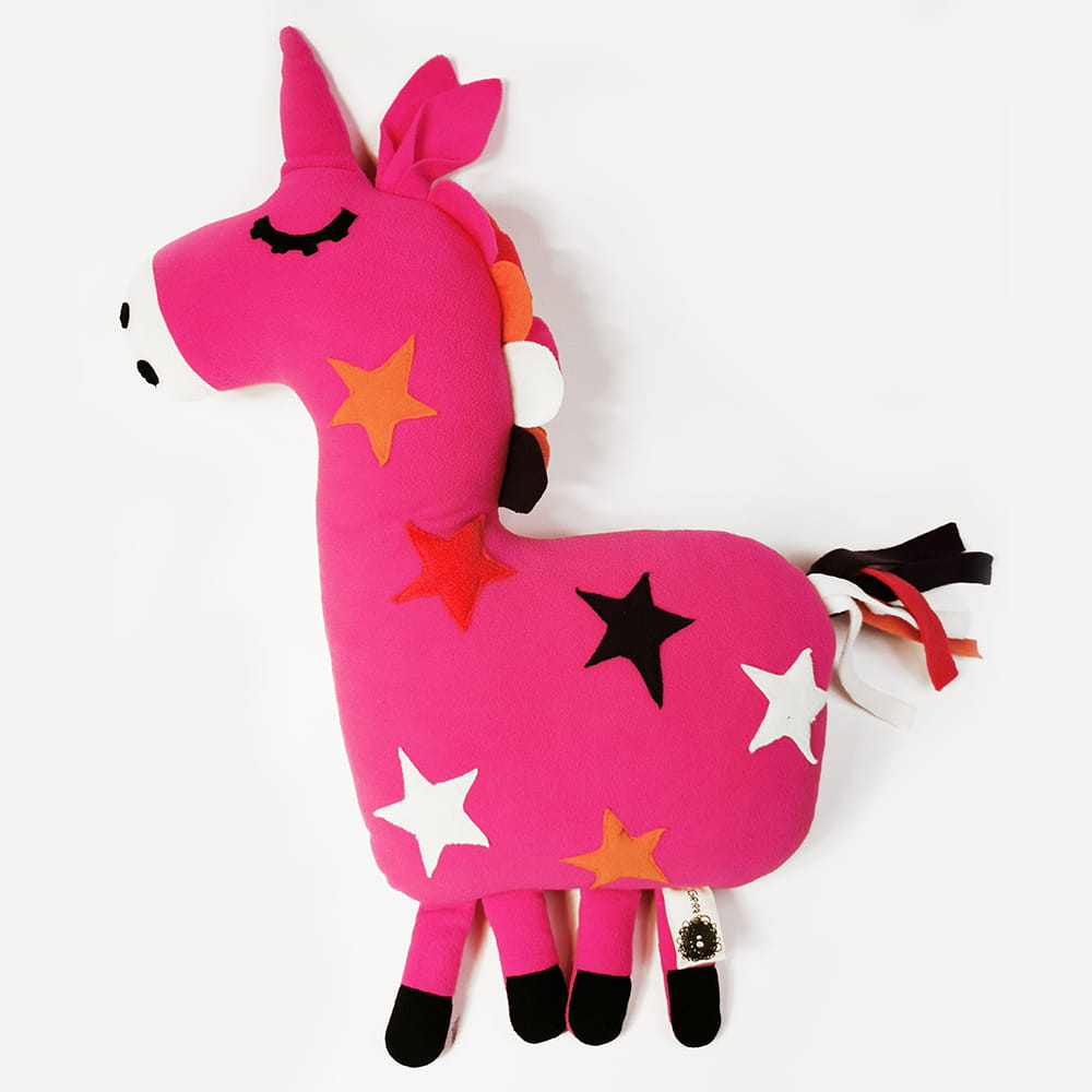 Różowy jednorożec w kolorowe gwiazdki. Uszyty z miękkiego polaru, Wypełniony atestowaną kulką silikonową.